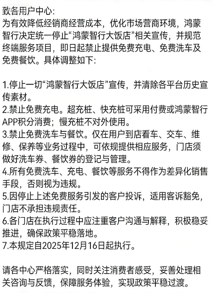 近日,鸿蒙智行向各用户中心发布通知,宣布自12月16日起停止“鸿蒙智行大饭店”相关宣传,并明确禁止门店继续提供免费充电、免费洗车及免费餐饮服务。这意味着,曾经以“服务体验”为卖点之一的鸿蒙智行,正式收紧了终端福利政策。